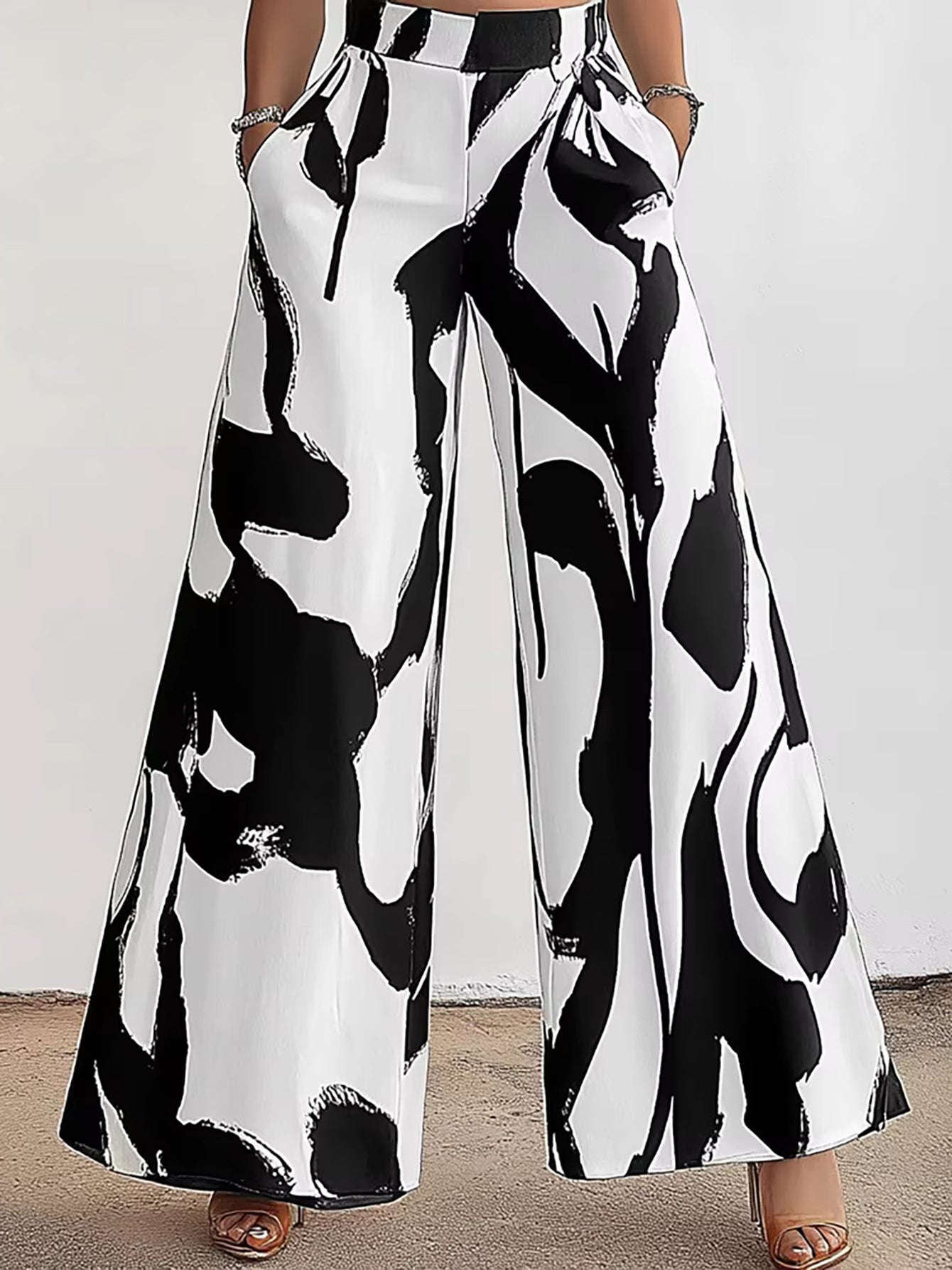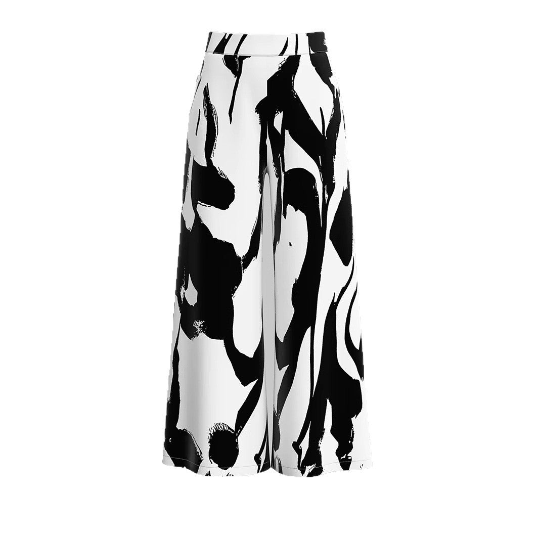 بنطلون نسائي واسع الساق مطبوع باللونين الأبيض والأسود بخصر مرتفع