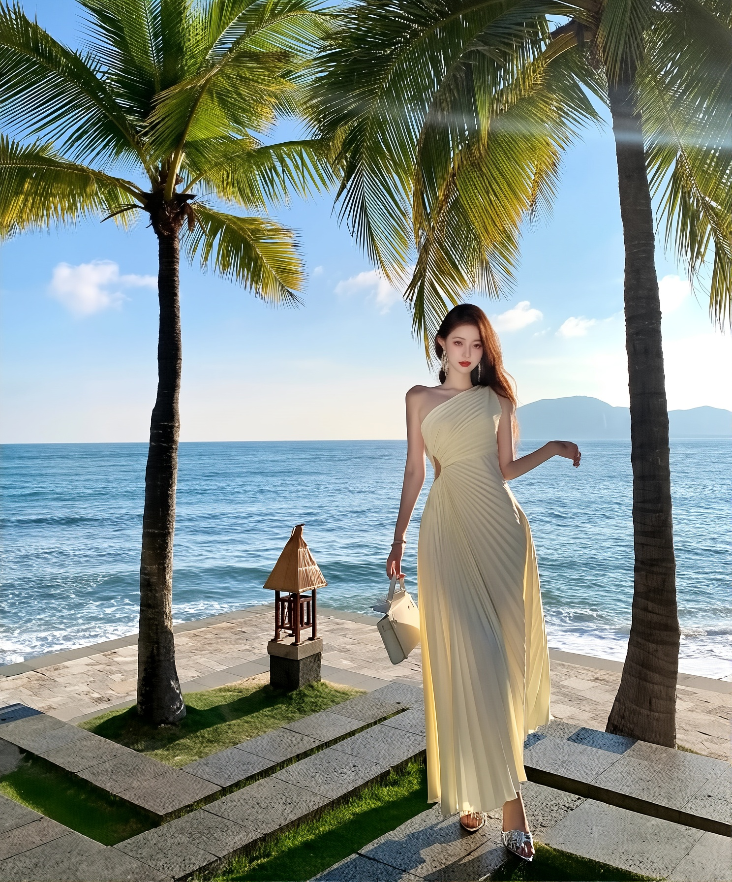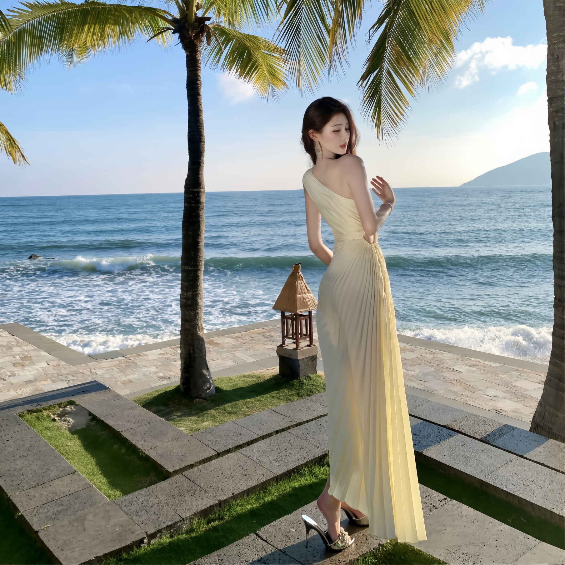 Pleated Slopping Shoulder Gown - Waistless Banquet Long Dress for Women