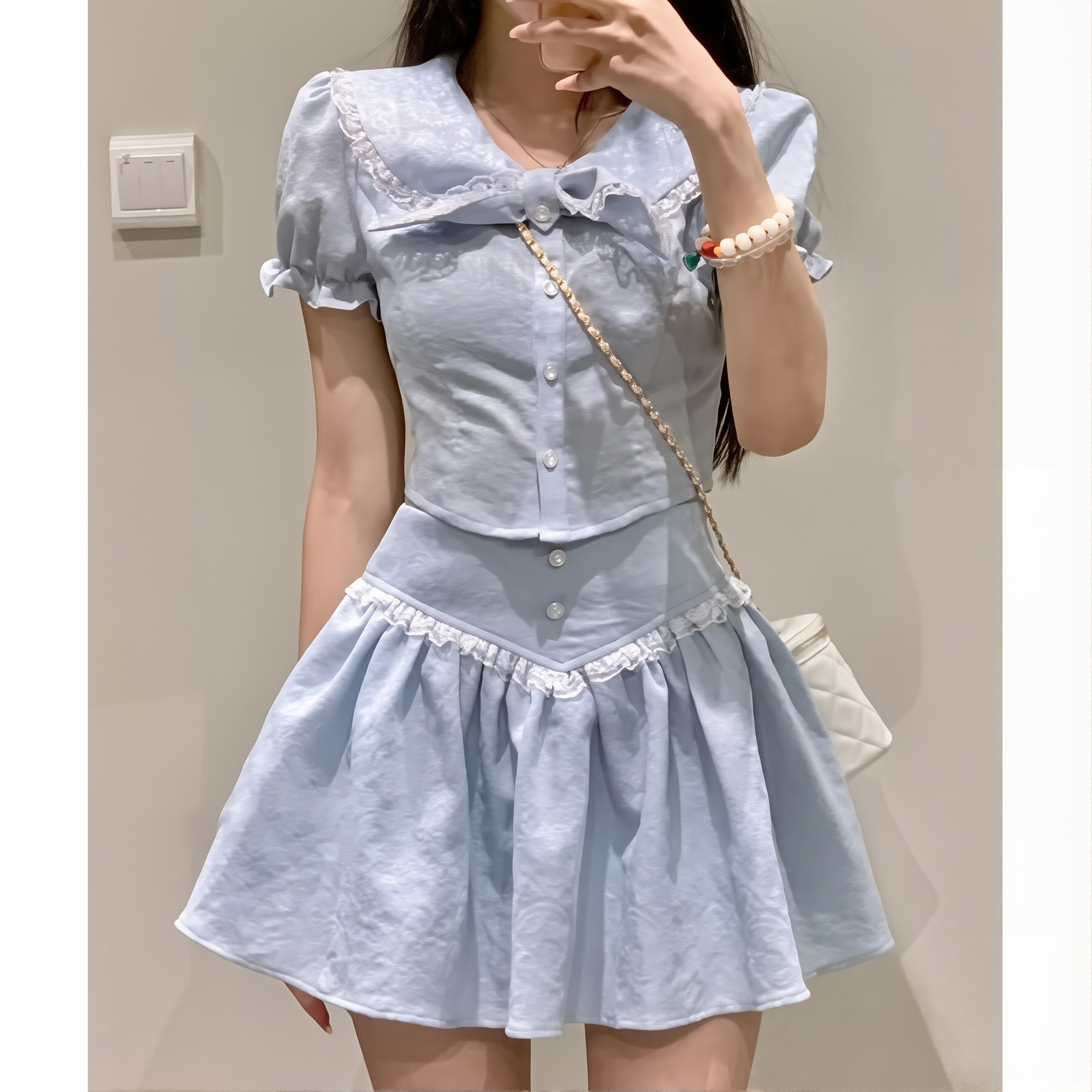 Chanel Style Two-piece Set French Tea Break Lace Double-layer Collar Short Shirt Ruffled A- Line Short Skirt Suit Women