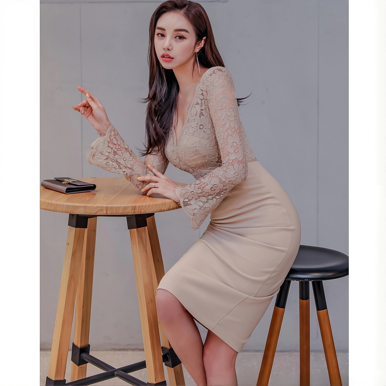 New Style Socialite Fashion Elegant V Neck Lace High Waist Women's Slimming Look Pencil Skirt