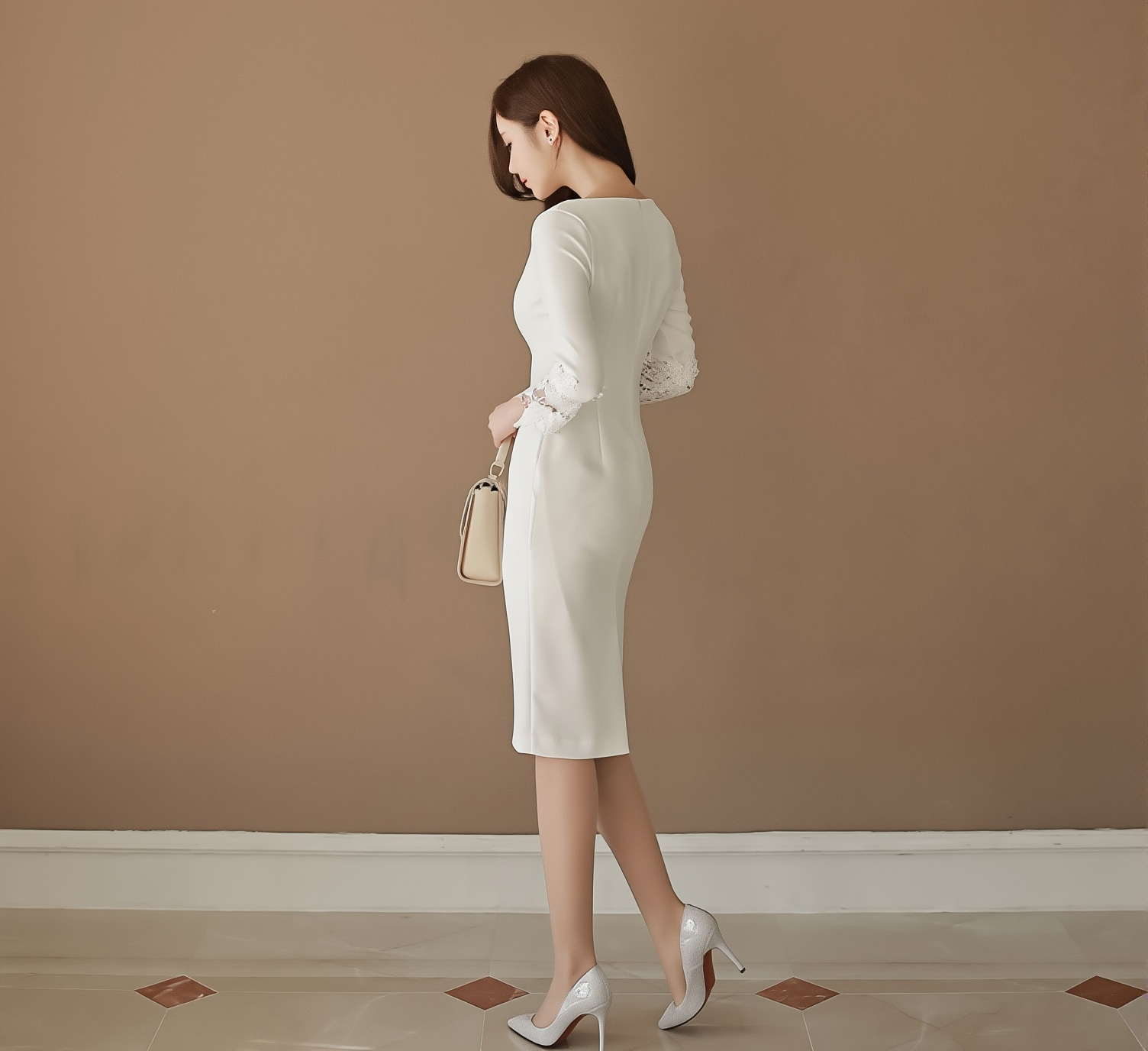 Cross-Border Dress Women's 2025 Autum New Korean Style Slim Fashion Pure Color Round Neck Lace Hip-Covering One-Step Skirt