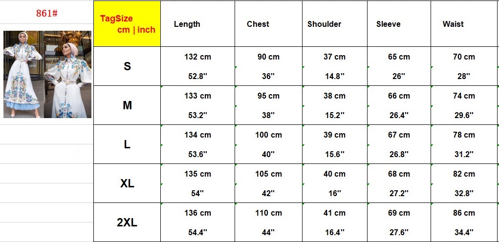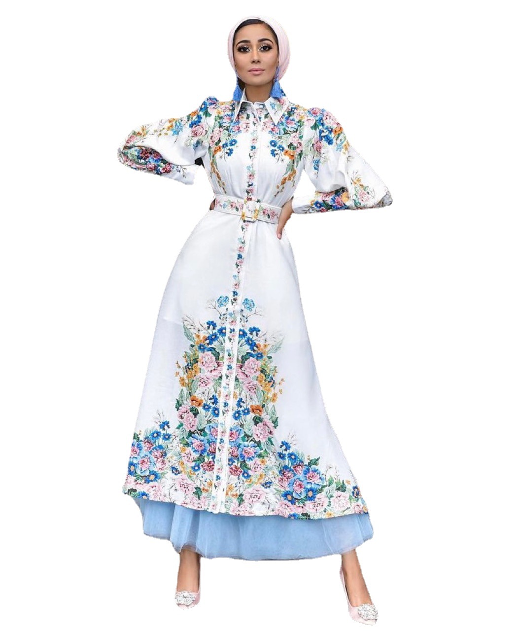 Fashion Puff Sleeves Lapel Robe Arabic Women's Digital Printed Mid Waist Long Dress