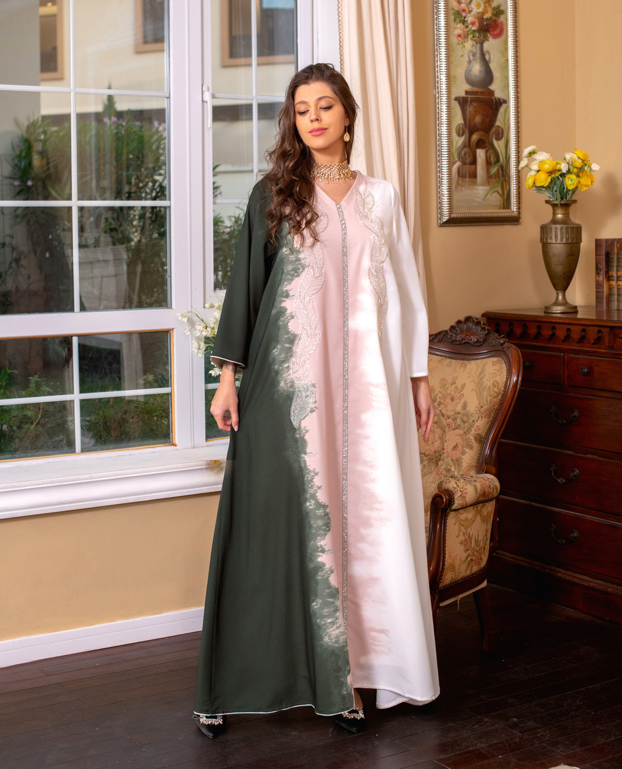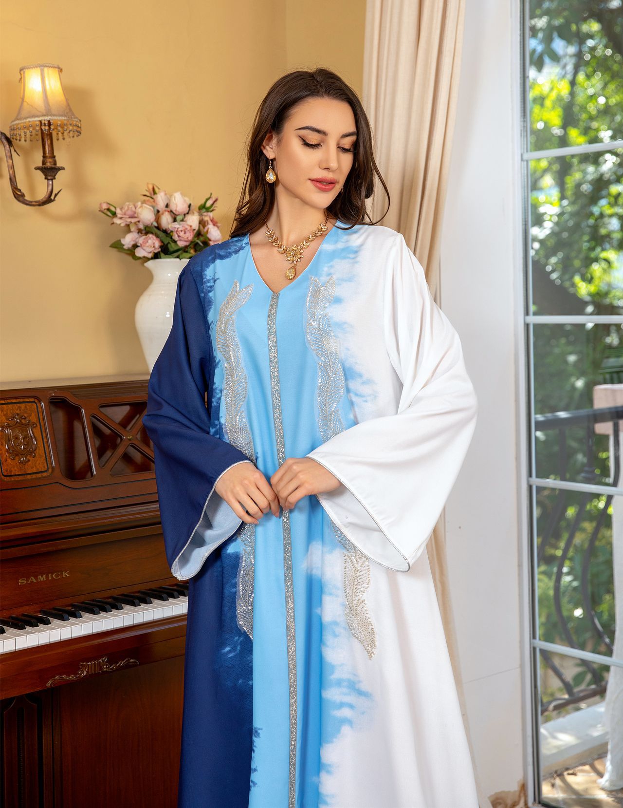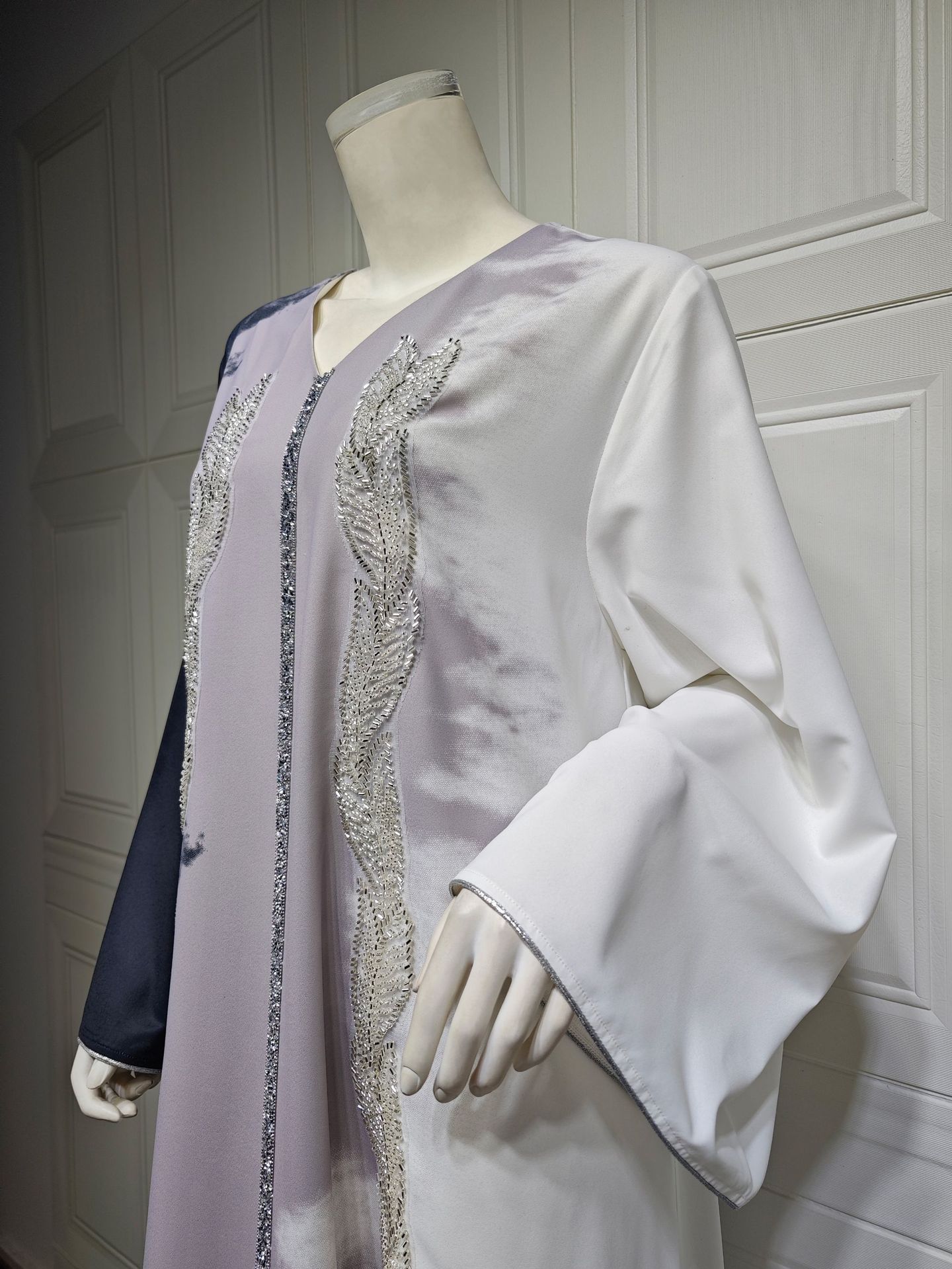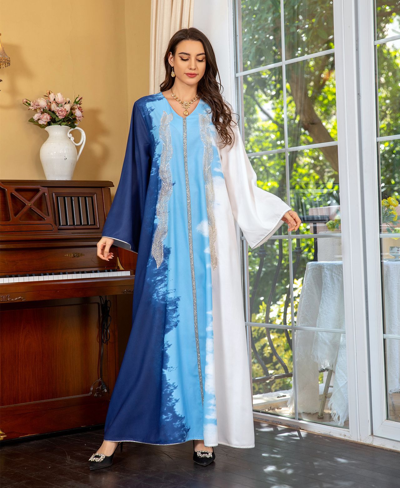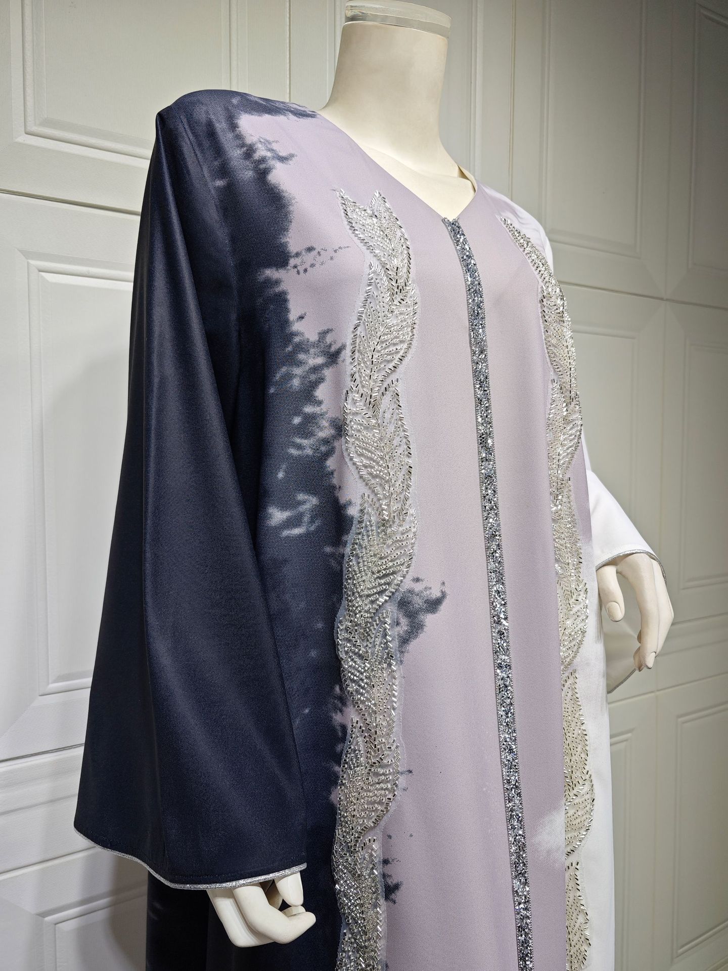 Pearl Embroidery Muslim Dress Tie-dye Rhinestone Robe