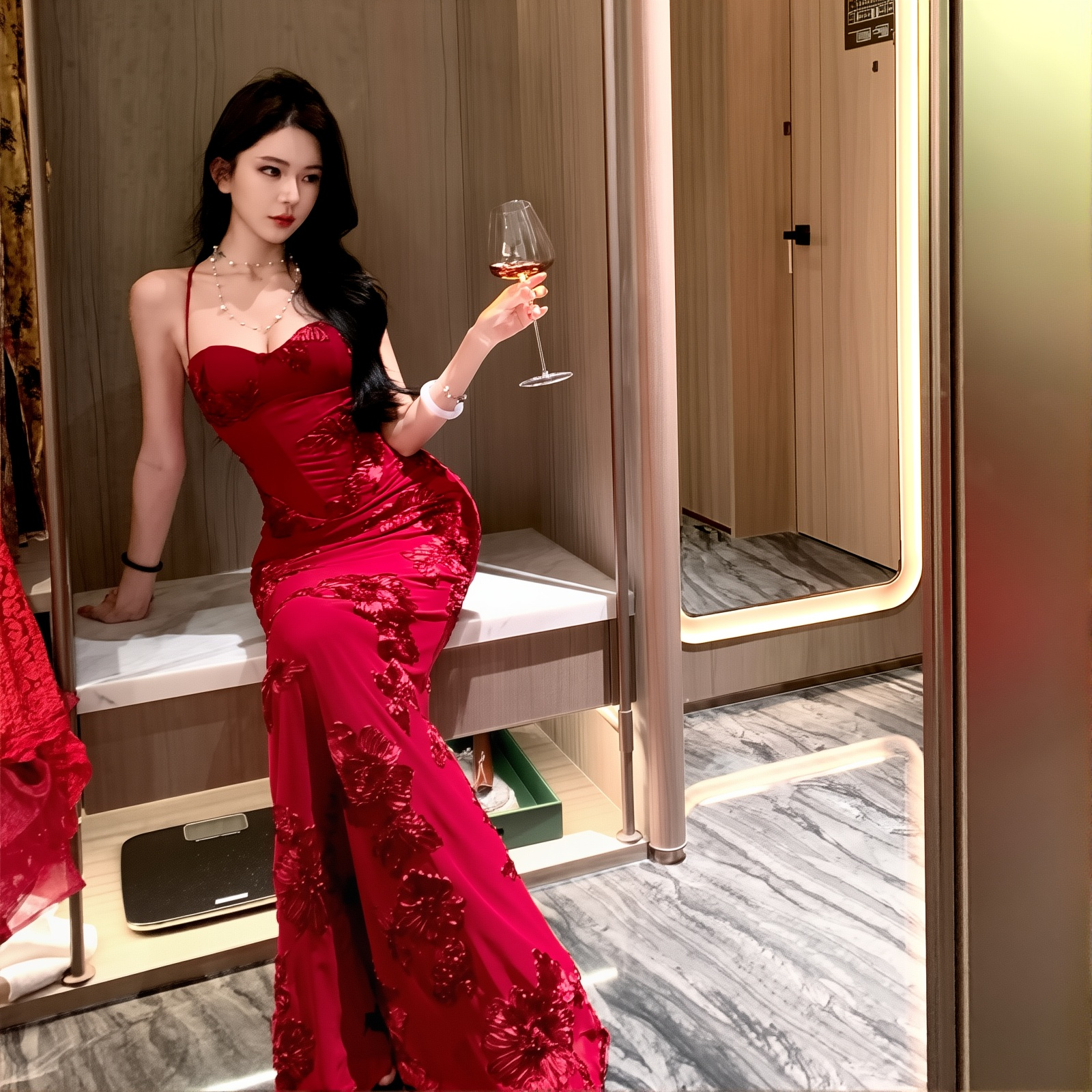 Backless Suspender Dress with Lace Embroidery - Elegant Slim Fishtail Skirt